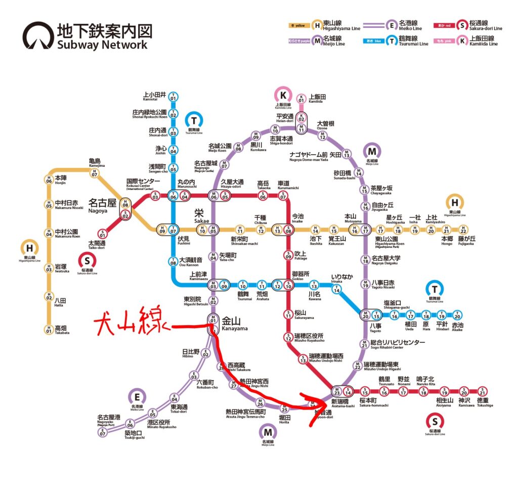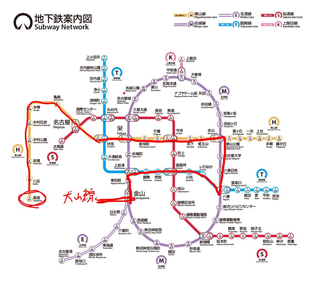あと、普段の通学は名城線で金山→犬山線の行き方で通ってもバレません。金山でしか乗換がないので。(下みたいな行き方)