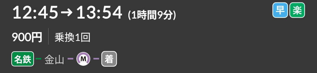 こんな感じのルートになります。金山から名城線でぐるっと名古屋大学まで行く形になります。