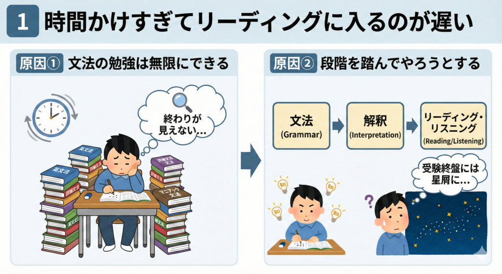これは①文法の勉強っていうのが無限にできしまう性質を持っていることと、②文法、解釈、リーディング・リスニングと段階踏んでやろうとするから必死におぼえた細かい文法知識が受験終盤には星屑になって空に飛んでいくことが原因です。