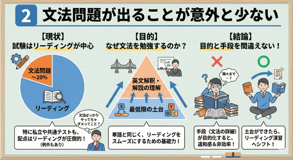 特に私立とか、がっつり文法問題もでる例外もありますが、基本的に英語ってリーディングが中心になってくると思うんですよ。(共テもそう)